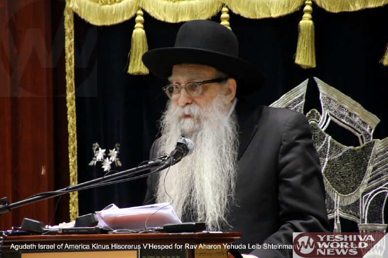 Hundreds, including scores of leading Roshei Yeshiva and Rabbanim, braved the frigid cold on Sunday evening to attend a Kinus Hisorerus V’Hesped following the recent petirah of Hagaon HaRav Aharon Yehuda Leib Shteinman zt”l. The Kinus was sponsored by Agudath Israel of America and held in the Novominsker Yeshiva in Boro Park, whose cavernous Bais Medrash was filled to capacity. In addition, countless others participated in the Kinus at satellite locations across the country, or from their homes via phone or LiveStream.