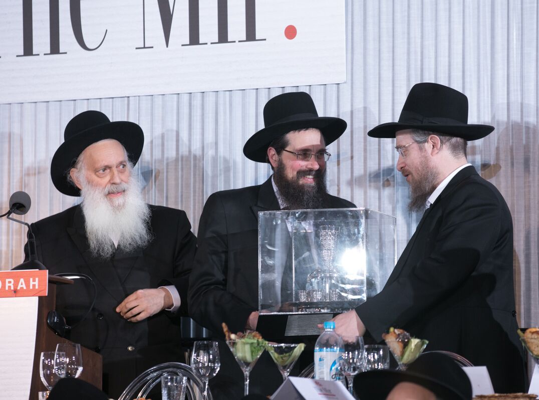 Harav Yitzchok Hellman, the Harbotzas Torah awardee, received a Ketzos and Nesivos that belonged to his father-in-law, the Rosh HaYeshiva Rav Nochum Partzovitz zatzal. The Kesser Shem Tov Award le’illuy nishmas Reb Pinchas and Mrs. Esther Wagner was presented to their children, Mr. and Mrs. Yehuda Wagner, Mr. and Mrs. Bezalel Wagner, and Mr. and Mrs. Yitzchok Wagner. A video showed a siyum hashas made by the talmidim of the Yeshiva at the home of Harav Nosson Tzvi Zt”l. Subsequently they traveled to the kever of the Wagners a”h where they davened on behalf of the Wagner family, in recognition of the award.