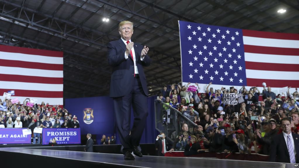 President Donald Trump took aim at familiar political targets and added a few fresh ones during a campaign-style rally Saturday night in an Upper Midwest state that gave him a surprising victory in the 2016 election.