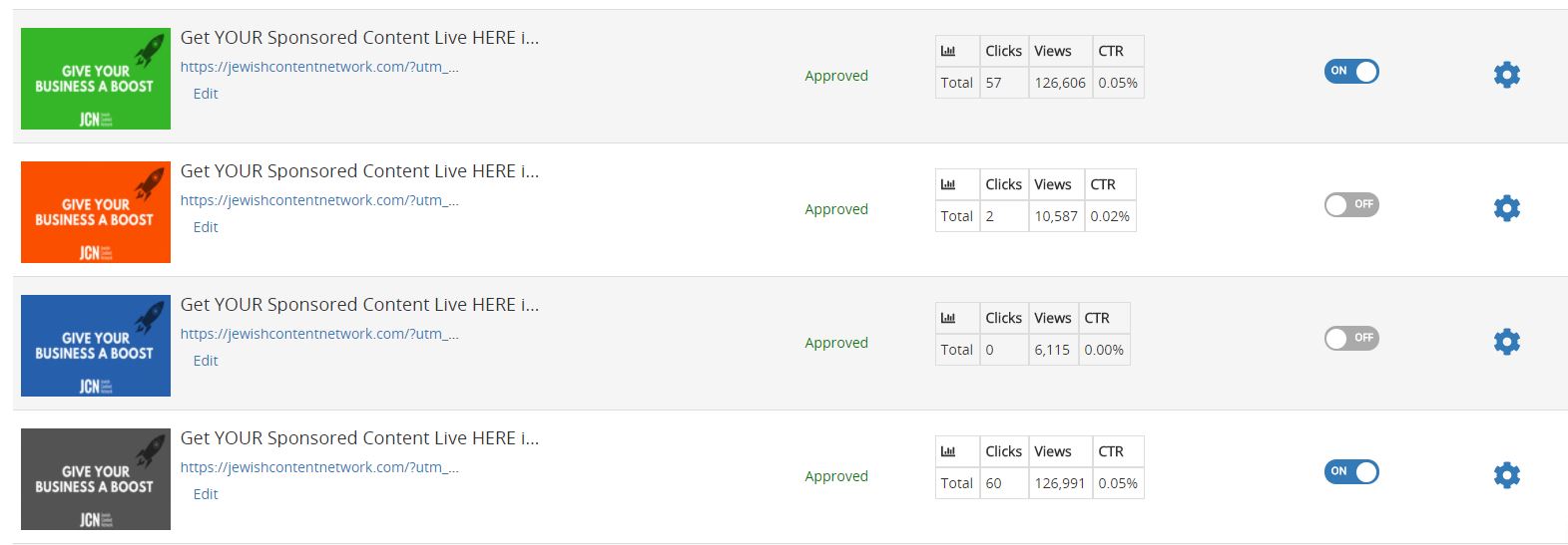 Pro tip: use the A/B testing capabilities of the platform to test multiple variations of your ad. In the example below, we tried different colored backgrounds on our otherwise identical ads. The ones with the blue and orange backgrounds performed the worst, and we turned it off.