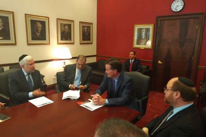 Around the table L-R: NYS Senator Simcha Felder, NYS Senator Martin Golden, Zelig Gitelis , Isaac Stern, NYS Senator Andrew J Lanza, NYS Senate Majority Leader John J. Flanagan