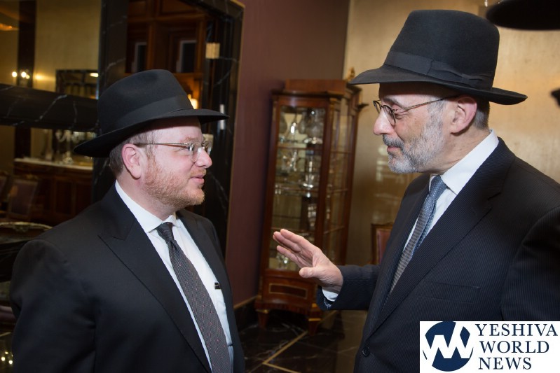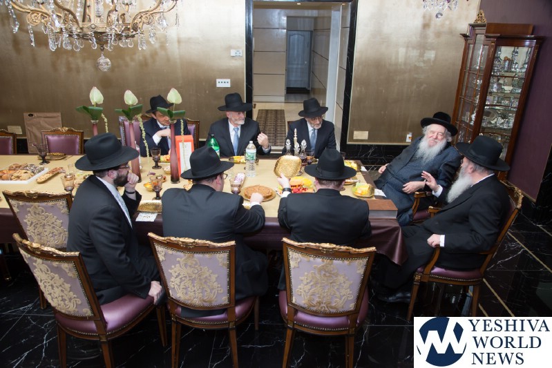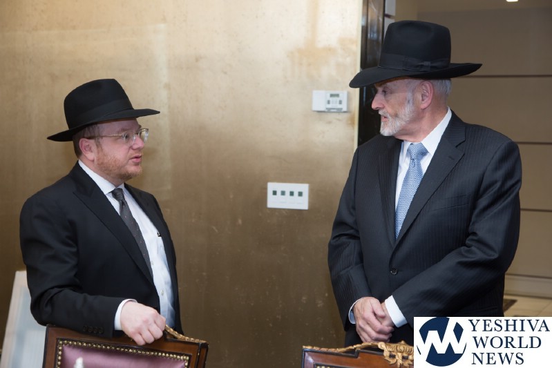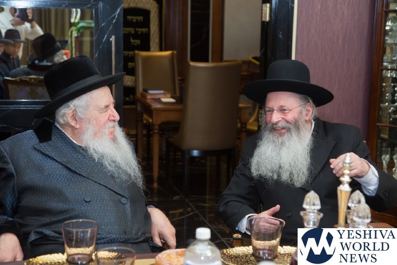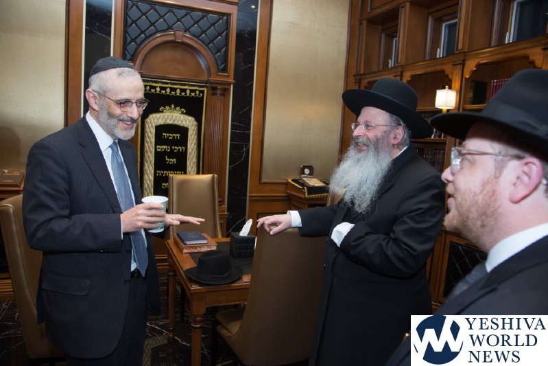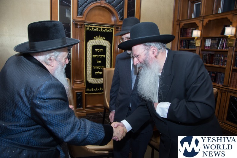 In celebration of this remarkable undertaking, and of R’ Ari’s appointment to the Board of Trustees of Agudas Yisroel, this past Wednesday evening, HaRav Yaakov Perlow, Novominsker Rebbe and Rosh Agudas Yisroel, and the Rosh HaYeshiva HaRav Aryeh Malkiel Kotler, Chaver Moetzes Gedolei HaTorah, were mechabeid R’ Ari by joining him for a l’chaim in his home.