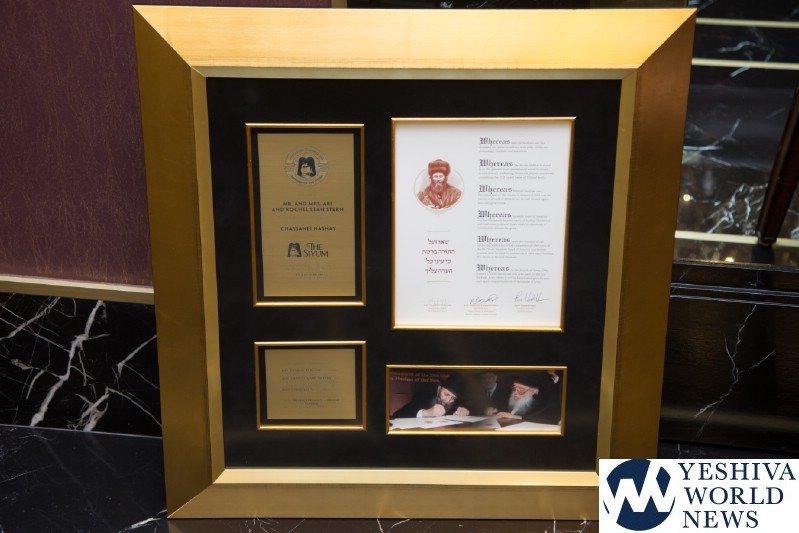 After warm Divrei Brachah from the Novominsker Rebbe, and Rabbi Naftali Miller, National Director of Development for Agudath Israel presented R’ Ari with a plaque containing an original copy of the contract for the Siyum HaShas in MetLife Stadium signed by the Novominsker Rebbe, Philadelphia Rosh HaYeshiva HaRav Shmuel Kamenetsky, Chaver Moetzes Gedolei HaTorah, and Mr. Ron VanDeVeen, President and CEO of MetLife Stadium.