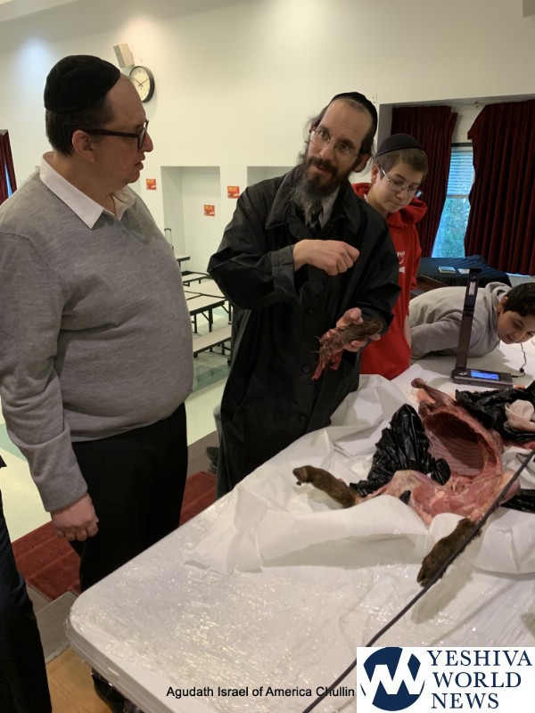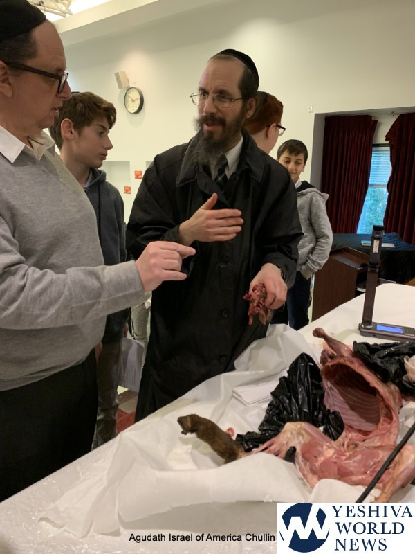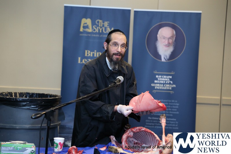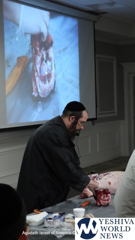 Rabbi Bendavid demonstrated everything one would need to know about the animal, literally head to toe, how to check a chalif, the special knife of a shochet, and he simanim of the animal. He even detoured from the Chullin related part of the presentation to show the wonderful nifla’os haBorei in many of the body’s remarkable systems. Rabbi Bendavid taught which part of the animal are given to the kohein as part of matnas kehunah, as well as which parts were sacrificed on the mizbei’ach. He clarified the difference between cheilev and shuman, and the difference between glatt and non-glatt meat.
