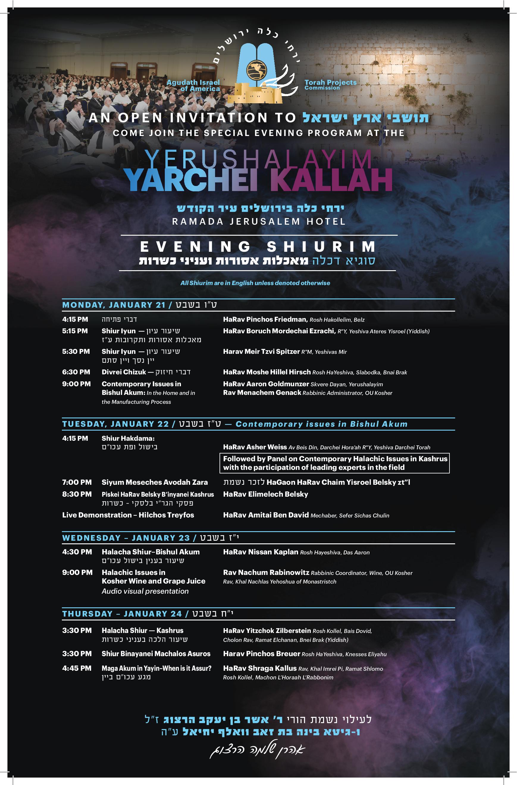Agudas Yisroel is pleased to announce that this year’s Yarchei Kallah in Yerushalayim will have an enhanced evening program, open to the public. The program, sponsored by R’ Aharon Shlomo Herzog in memory of his parents, will have an emphasis on practical halachah and points of particular interest from the sugya d’kallah. The complete schedule is attached.