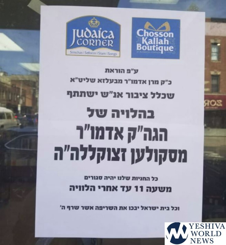 The first hesped will be the oldest son of the Rebbe, Harav Yeshaya Yaakov, who is currently the Rov at the Skulener Bais medrash in Montreal. The second Hesped will be delivered by HaRav Shimon Yoel Weinberger, a son-in-law of the Rebbe, who serves as the Dayan of the Skulener kehilla in Williamsburg.