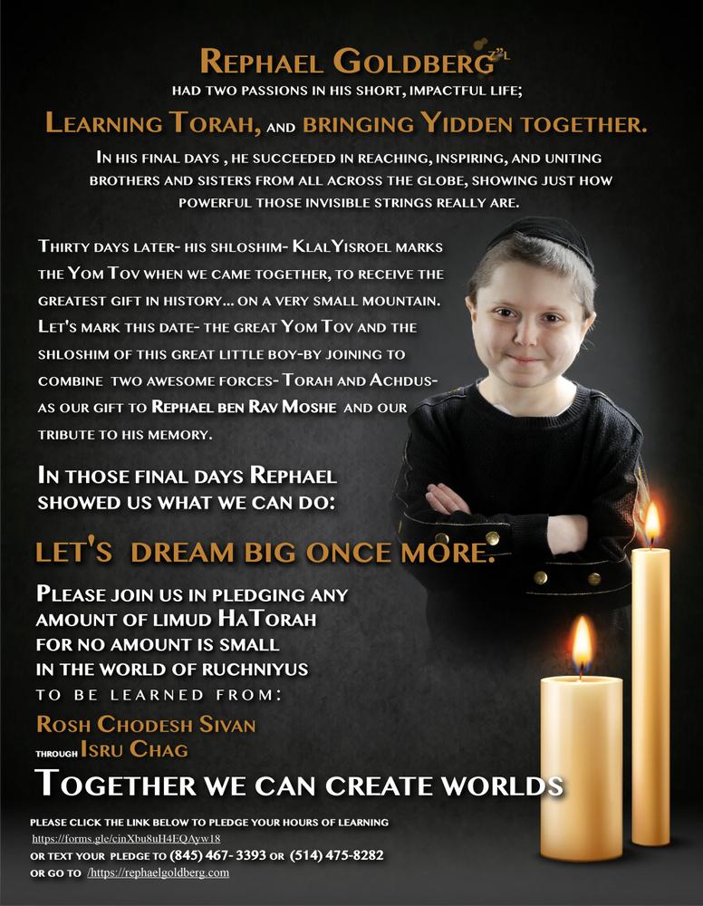 Thirty days later – his Shloshim – Klal Yisroel marks the Yom Tov where we came together, to receive the greatest gift in history…on a very small mountain. Lets mark this date – the great Yom Tov and the Shloshim of this great little boy – by joining to combine 2 awesome forces. TORAH & ACHDUS as our gift to Rephael ben Moshe and a tribute to his memory.