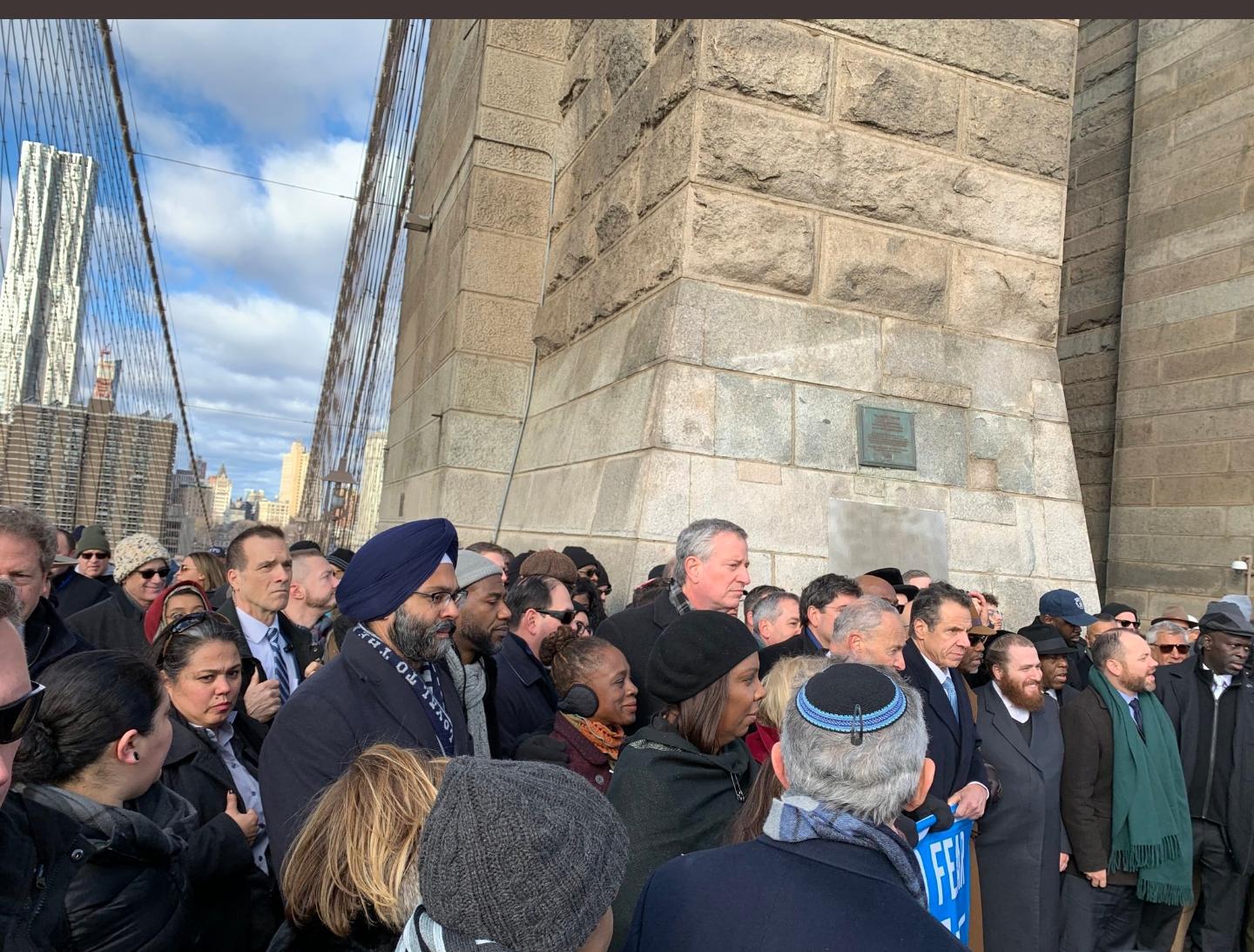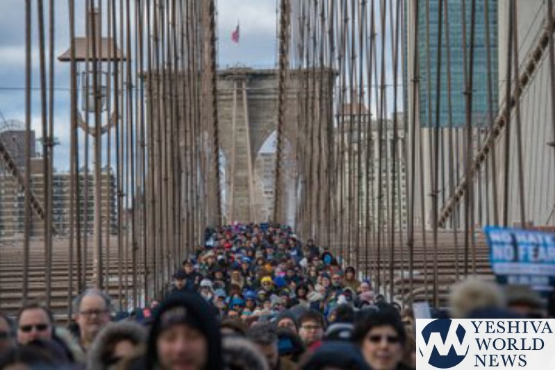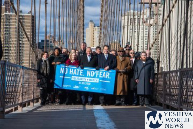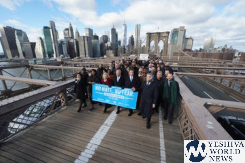 Throngs of demonstrators joined by elected officials walked solemnly across the Brooklyn Bridge in a solidarity march Sunday against anti-Semitism and all acts of hate.