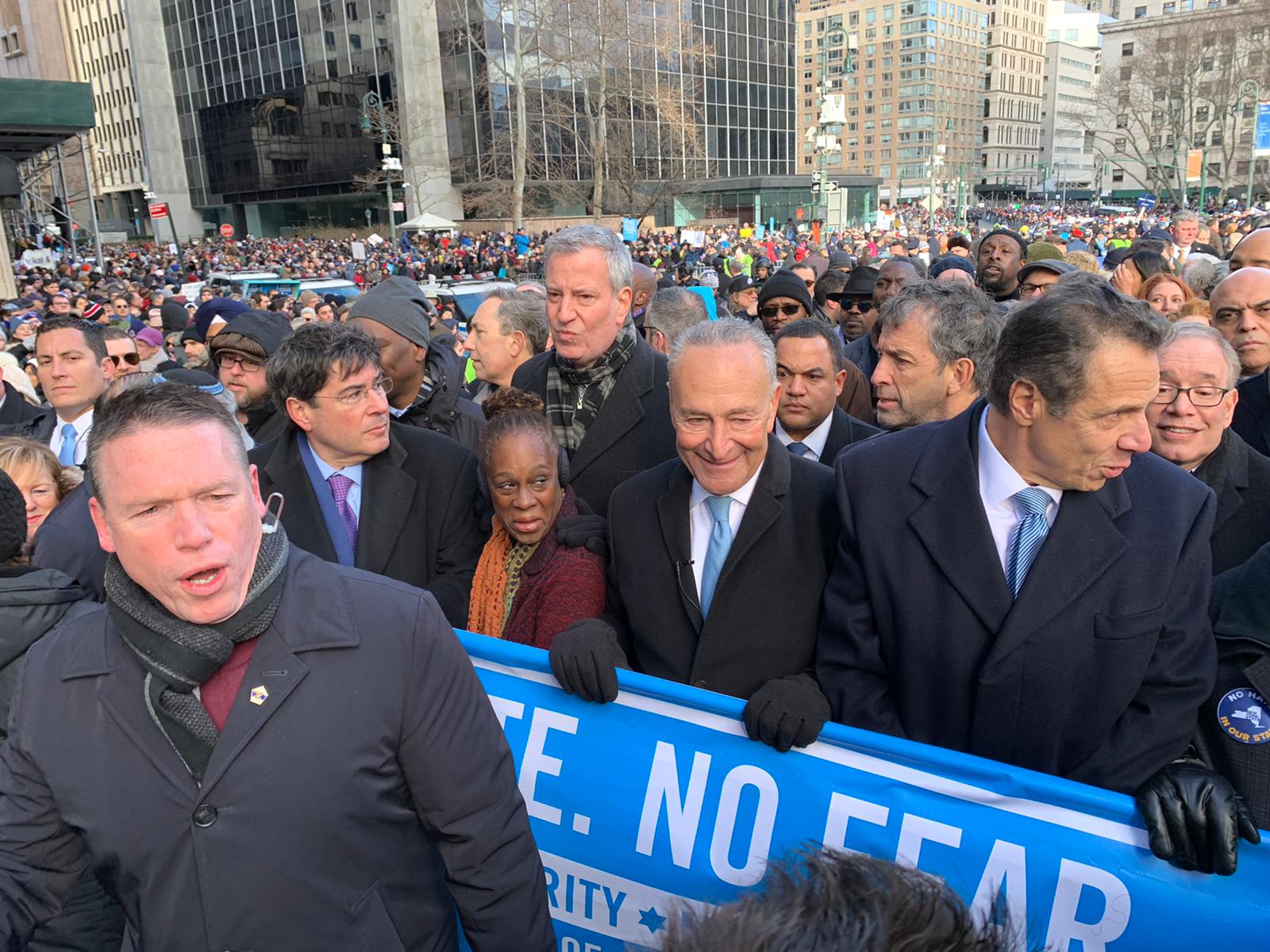 Among the elected officials at the march were New York Gov. Andrew Cuomo, New York City Mayor Bill de Blasio, and U.S. Sens. Charles Schumer and Kirsten Gillibrand.
