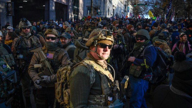 Several thousand activists — mostly white and male, many clothed in camouflage and waving flags with messages of support for President Donald Trump — appeared hours before the 11 a.m. rally was set to begin.