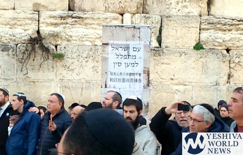 A mass tefillah gathering took place at the Kosel on Sunday at 4:30 p.m. for those affected by the coronavirus. The gathering was organized by Harav Shmuel Eliyahu, the Chief Rabbi of Tzfat, together with the Israeli branch of the Orthodox Union. The senior representative of the Chinese embassy in Israel participated in the gathering.