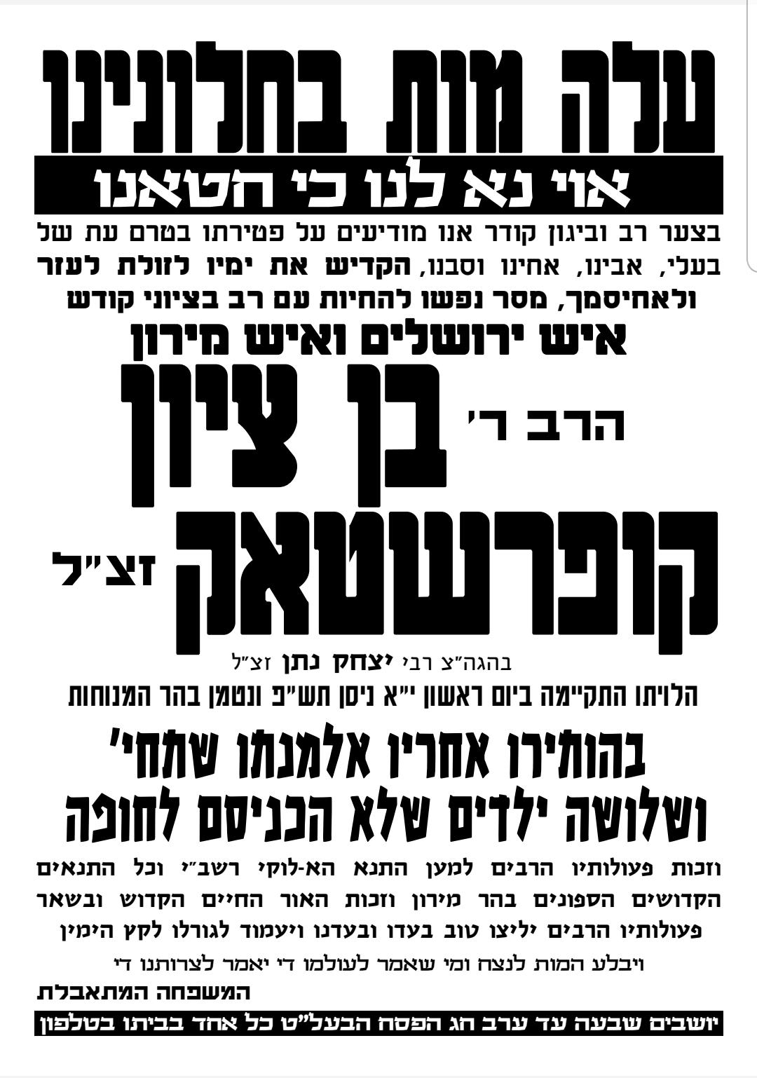 Harav Ben Tzion Coopertstock, zt’l, known as the “Abba of Meron” for his constant and continuous chessed throughout the year, day and night, to the kever of the Rashbi and other sites and providing hundreds of thousands of mispallelim at Meron with food and drink was Israel’s 46th victim of the coronavirus.
