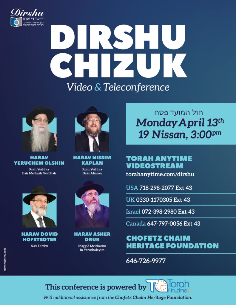 Under the auspices of Dirshu, the worldwide organization whose raison d’être is chizuk haTorah, Gedolei Yisrael from across the world will be uniting to address Klal Yisrael in a video/teleconference, this coming Monday, Chol Hamoed Pesach, 19 Nissan/April 13 at 3pm.