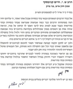 Harav Chaim ended the letter by writing: “And in the zechus of accepting these matters, Hashem should return us swiftly to His avodah in shuls and batei medrashos b’rov am and accept our tefillos b’ahavah and ratzon.”