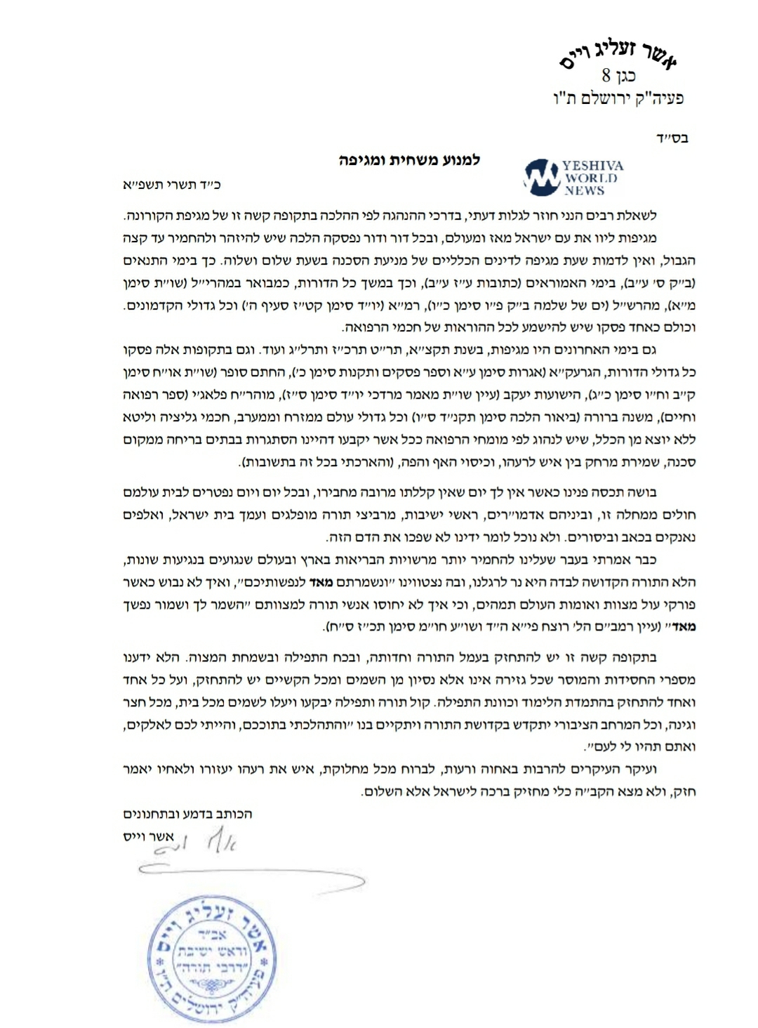 Hagaon Rav Asher Weiss wrote a scathing letter on Tuesday calling for the public to adhere to Health Ministry regulations and censuring the behavior of frum Jews who don’t adhere to health regulations.