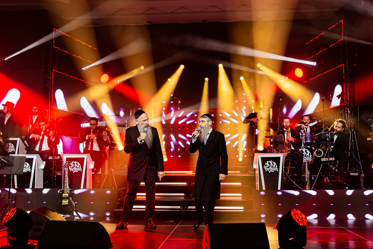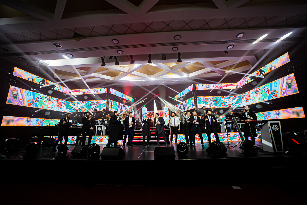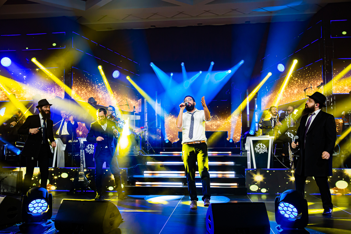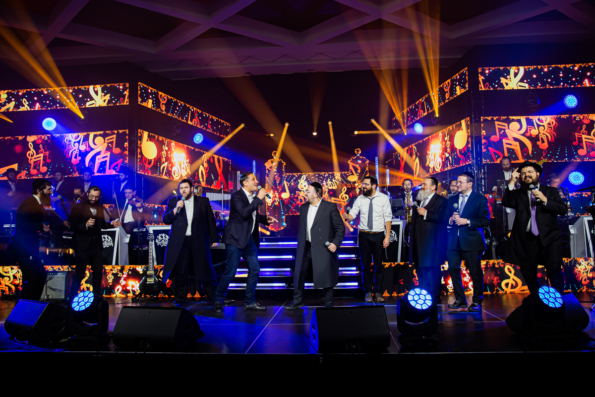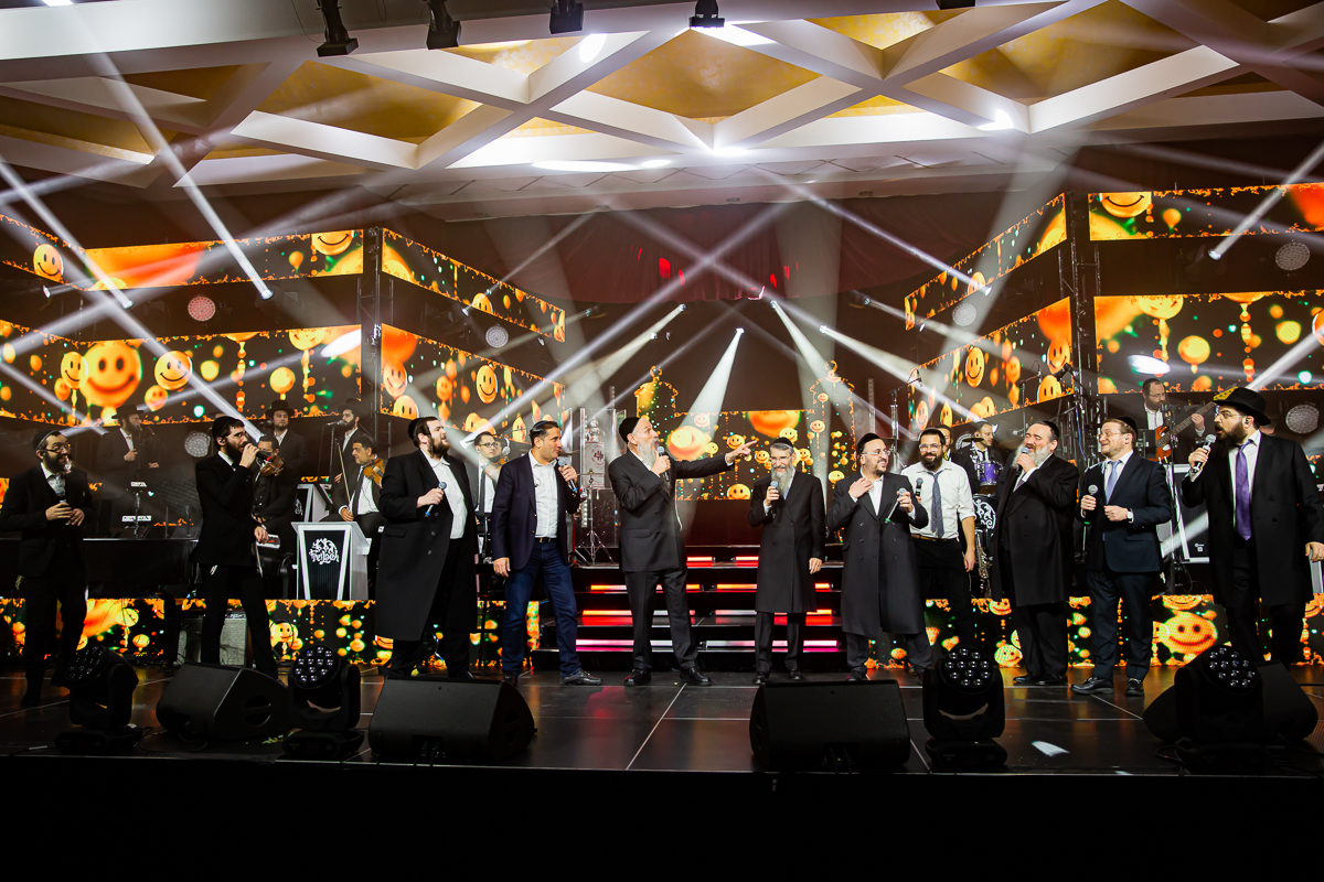 Avraham Fried, Mordechai Ben David, Chaim Yisrael, Eli Marcus, Baruch Levine, 8th Day band, Lipa Schmeltzer, Shmuli Ungar, Shlomo Simcha and Mendy J sang solo and in duet, soulful tunes and rousing Hakafos niggunim, as they danced across the stage late into the night.