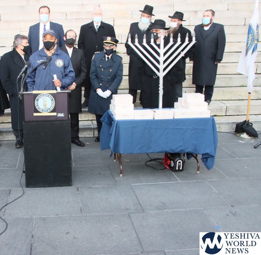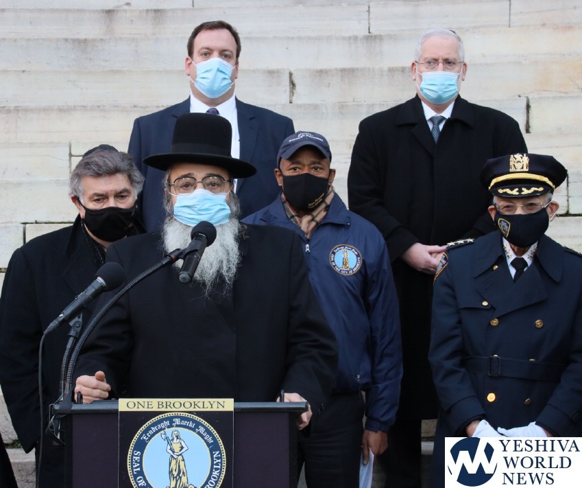 Also seen are Rabbi Moshe David Niederman executive director of UJO, Rabbi Abe Friedman, Rabbi Avi Greenstein of the BPJCC, Rabbi Alvin Kass NYPD chaplain, Rabbi Joseph Potasnik FDNY chaplain, Rabbi Hirsch Berkowitz MTA chaplain, Rabbi Shai Melman of the Flatbush JCC, Rabbi Mendel Nernack of the Staten Island JCC, Deputy Inspector Richard Taylor of the NYPD community affairs.