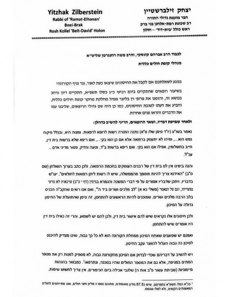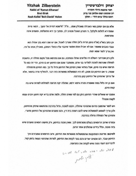 HaGaon HaRav Yitzchak Zilberstein, Rav of Ramat Elchanan and a member of the Moetzes Gedolei HaTorah, publicized a p’sak din halacha on Wednesday on being vaccinated against the coronavirus.