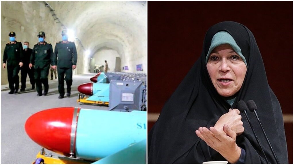 In this photo released Jan. 8, 2021, by Sepahnews, the website of the Iranian Revolutionary Guard, commanders of Iran's paramilitary Revolutionary Guard walk past missiles during a visit to a new military base in an undisclosed location in Persian Gulf in Iran. (Sepahnews via AP); Faezeh Hashemi Rafsanjani (By Tasnim News Agency, Wikimedia Commons)