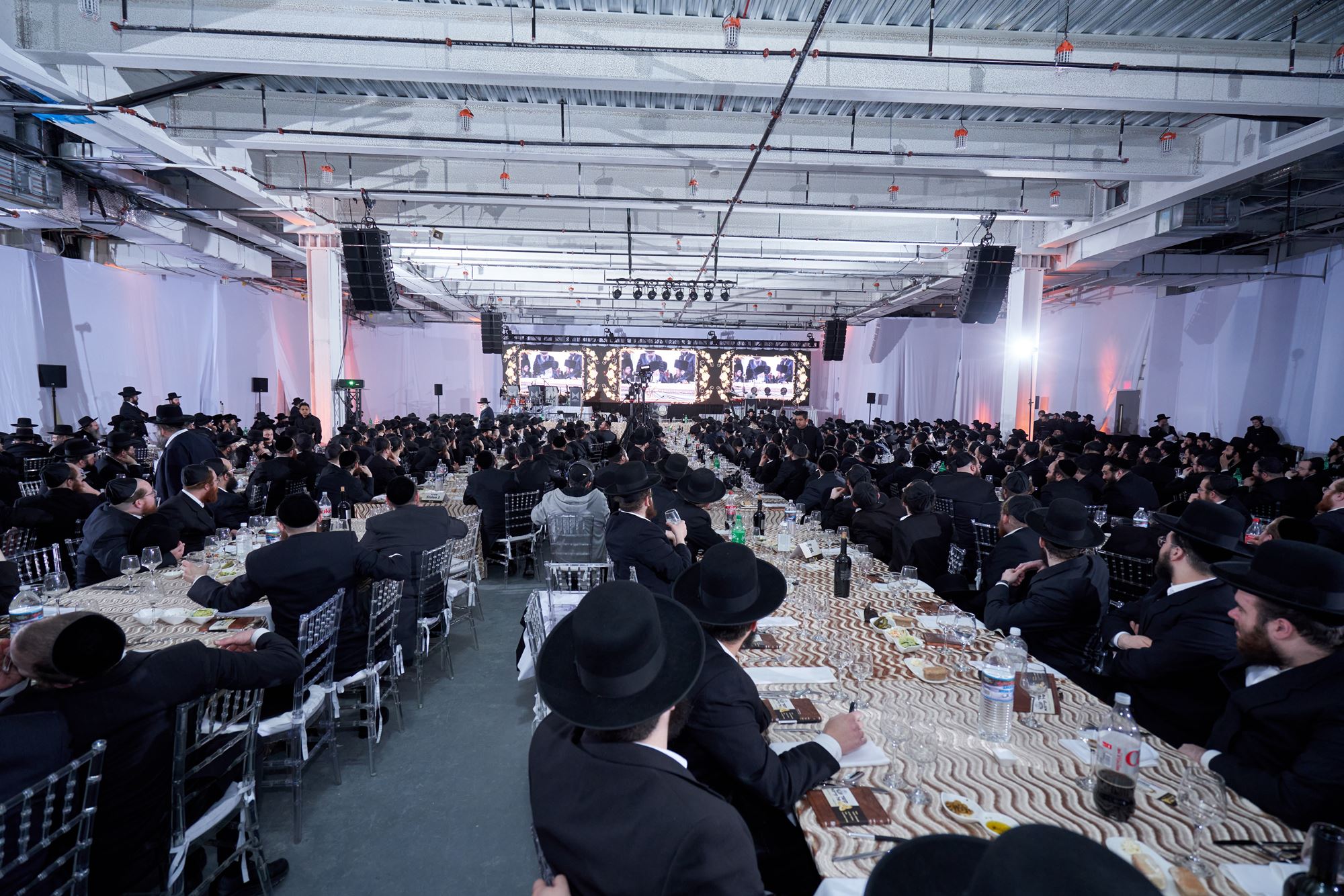 A special video presentation of the “days of joy” in the holy court was shown on massive screens, virtually transporting the audience, which drank one every moment of the holy sites of the rebbes simcha, into the wee hours of the night.
