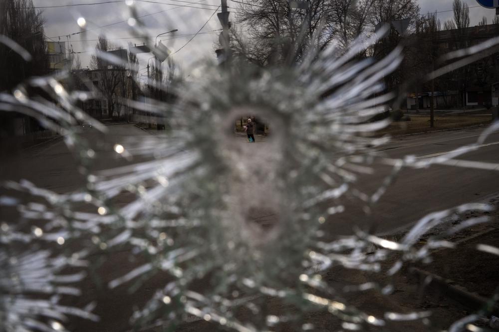 A man is seen through a bullet hole of a machine-gunned bus after an ambush in the city of Kyiv, Ukraine, Friday, March 4, 2022. While a small group of reservists were burying their comrade, 54-year-old Volodymyr Nezhenets, who was one of three killed on Feb. 26 in an ambush Ukrainian authorities say was caused by Russian 'saboteurs', a few kilometers away from the cemetery, the remains of the convoy Volodymyr was killed in 6 days ago still stands in the road with charred vehicles, a bus riddled with bullets, a spatter of blood on the drivers seat. (AP Photo/Emilio Morenatti)