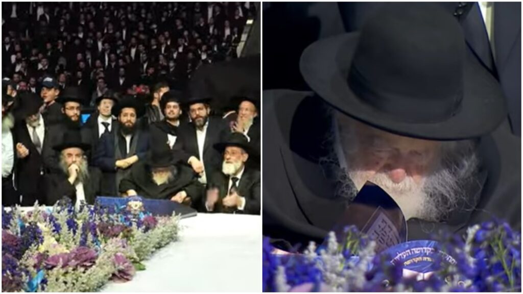 The hundreds of attendants stood up and sang enthusiastically in the Gadol HaDor’s honor when HaRav Chaim, z’tl, was wheeled into the hall by his son and grandson, HaGaon HaRav Yitzchak Shaul and Reb Yanky.