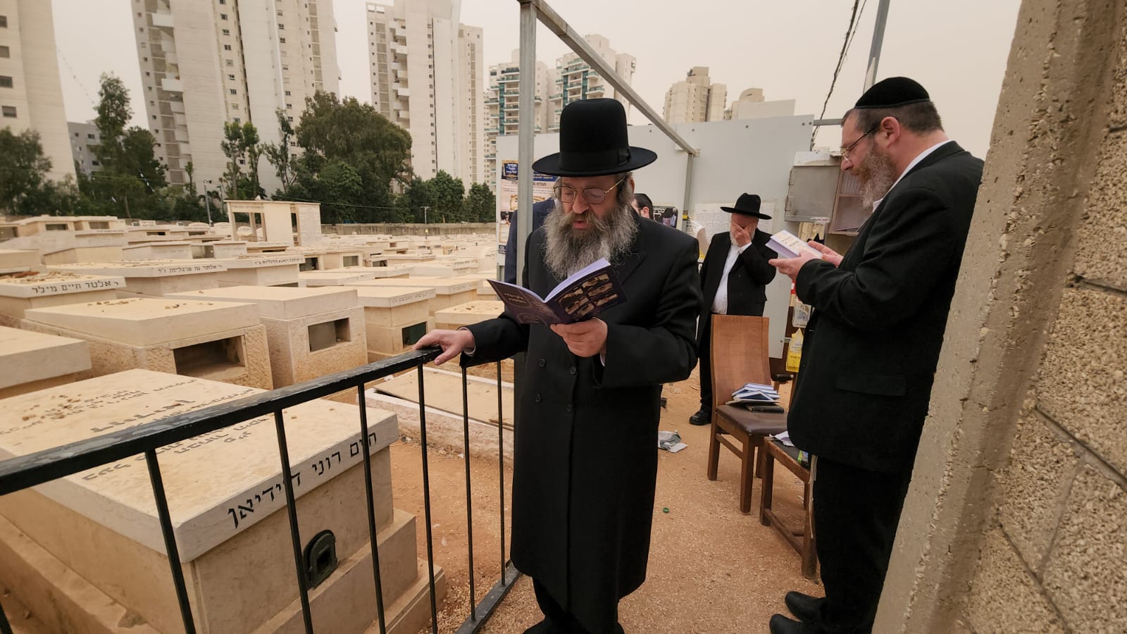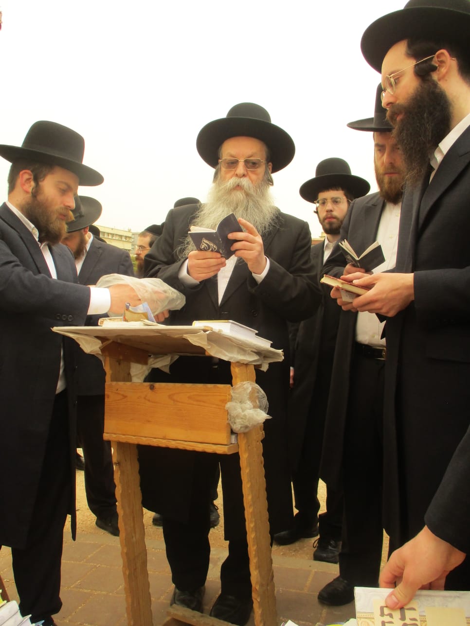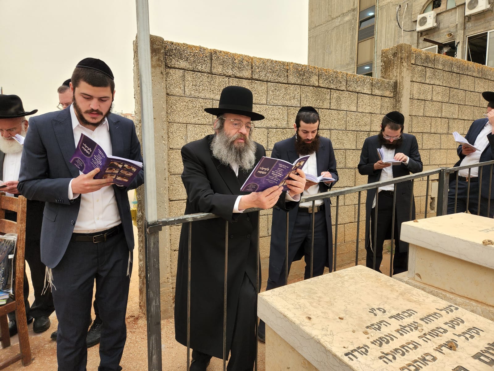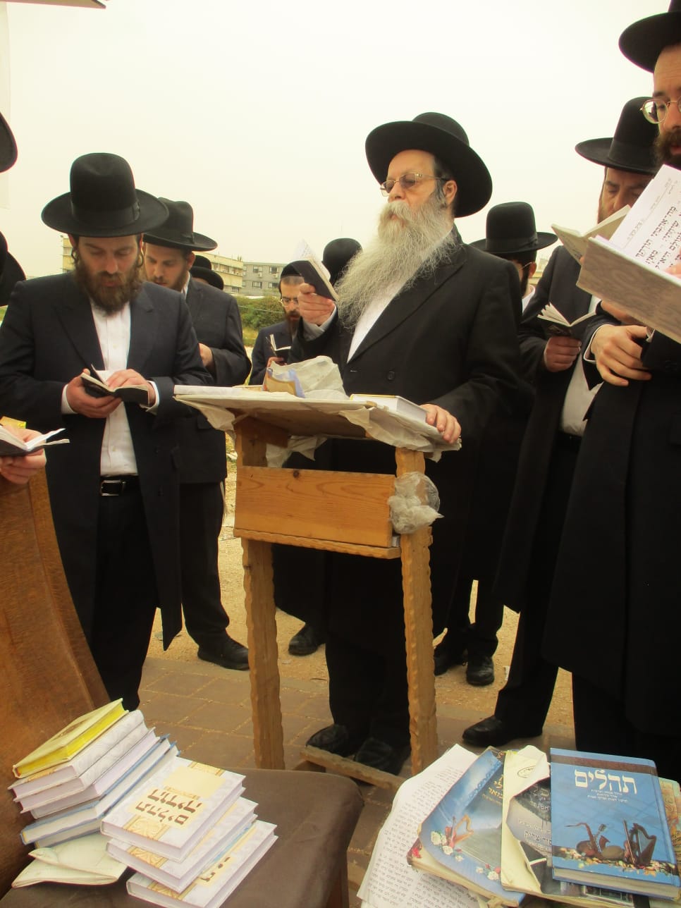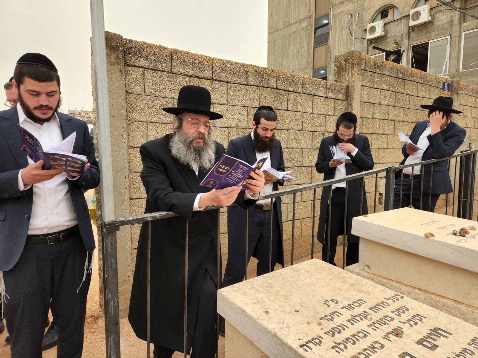 In lieu of the Shloshim of the passing of the Sar HaTorah, HaGaon Rav Chaim Kanievsky zatzal’s family and close students visited the gravesite earlier today on isru chag. As is known, Rav Chaim passed away on Shushan Purim the 5th of Adar Sheini. He was buried in the Shomer Shabbos Cemetery in Bnei Brak. Since the shloshim itself fell on Pesach, one does not visit the cemetery. This morning, immediately after vasikin davening, the family and close students went to the gravesite. The Tehillim were recited by Maran’s son, Rav Shlomo shlita, Rosh Yeshiva of Yeshivas Kiryas Melech. Afterward, the kaddish was recited by his son Rav Shaya Kanievsky shlita, the Rosh Kollel of Orchos Yosher.