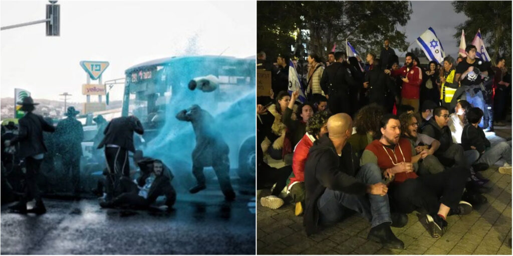 Police spray Chareidim with water cannon at protest in Jerusalem. (Photo: Yishai Yerushalmi/B'Chadrei Chareidim); Activists lock arms in Tel Aviv, Israel, to protest against Prime Minister Benjamin Netanyahu's government, Motzei Shabbos, Jan. 7, 2023. (AP/ Tsafrir Abayov)