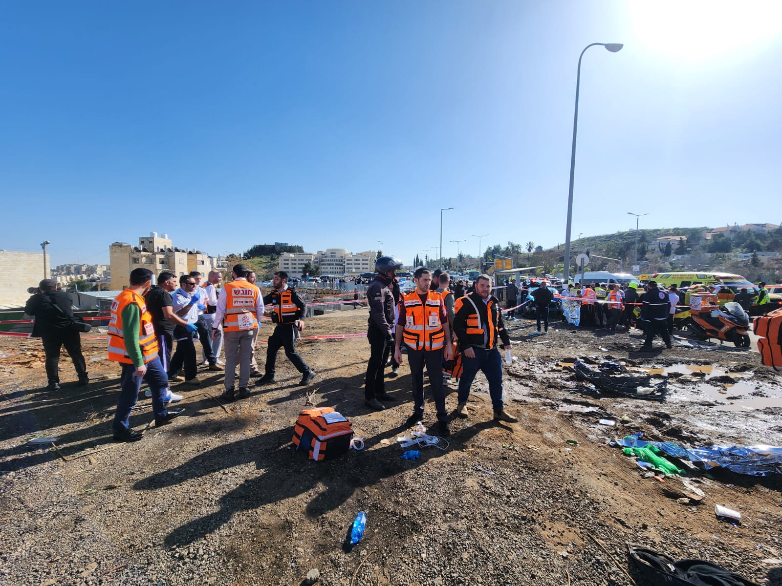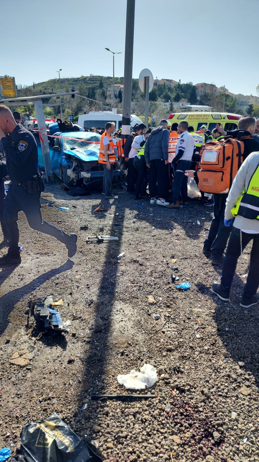 MDA Paramedic Lishai Shemesh who was in the area at the time of the attack: “I was in the car with my wife and children and noticed a car driving fast into the bus stop and crushing the people who were waiting there. I stopped at the side and immediately ran towards the victims. A security person neutralized the terrorist. It was a shocking scene, we saw several victims including 6–8-year-old children who were lying unconscious. We immediately began to triage the victims and provide life-saving treatment. MDA teams were immediately at the scene in large numbers, and continued treatment while conveying to hospital. I joined one of the ambulances and we conveyed a 26 year old male with a head injury in serious condition to Shaare Tzedek hospital.”