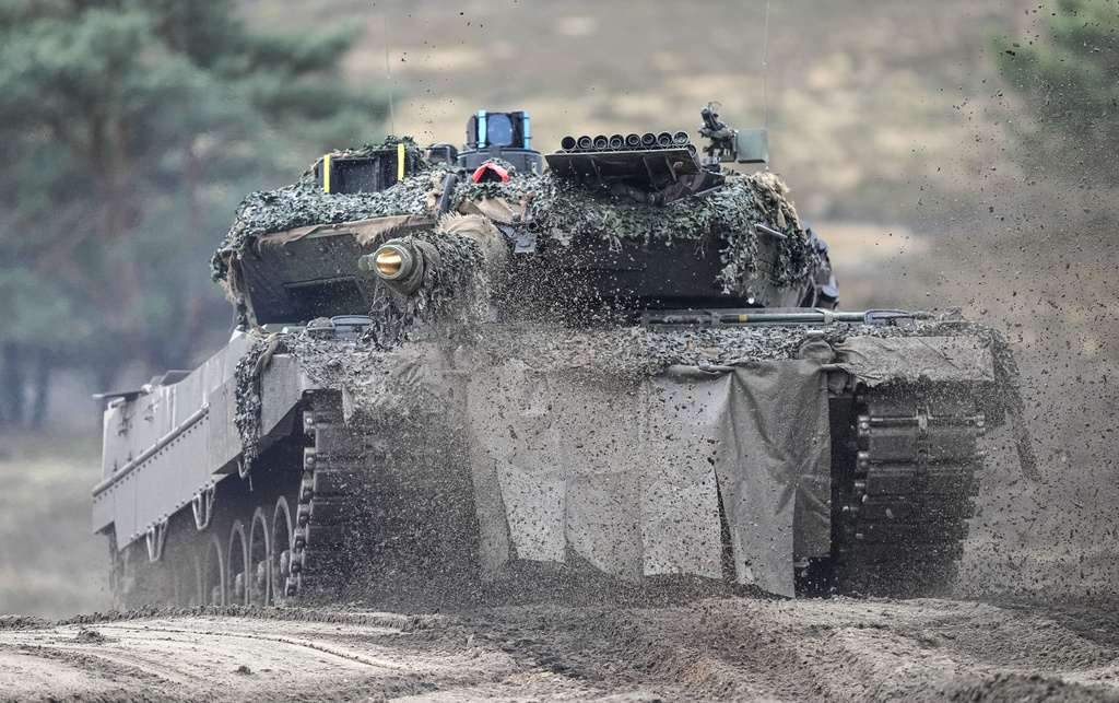 FILE — A Leopard 2 tank is seen in action during a visit of German Defense Minister Boris Pistorius at the Bundeswehr tank battalion 203 at the Field Marshal Rommel Barracks in Augustdorf, Germany, Wednesday, Feb. 1, 2023. An independent Sweden-based watchdog says the world military spending has grown for the eighth consecutive year in 2022 to an all-time high of $2240 billion leading to a sharp rise of 13% taking place in Europe, chiefly due to Russian and Ukrainian expenditure.. (AP Photo/Martin Meissner, file)