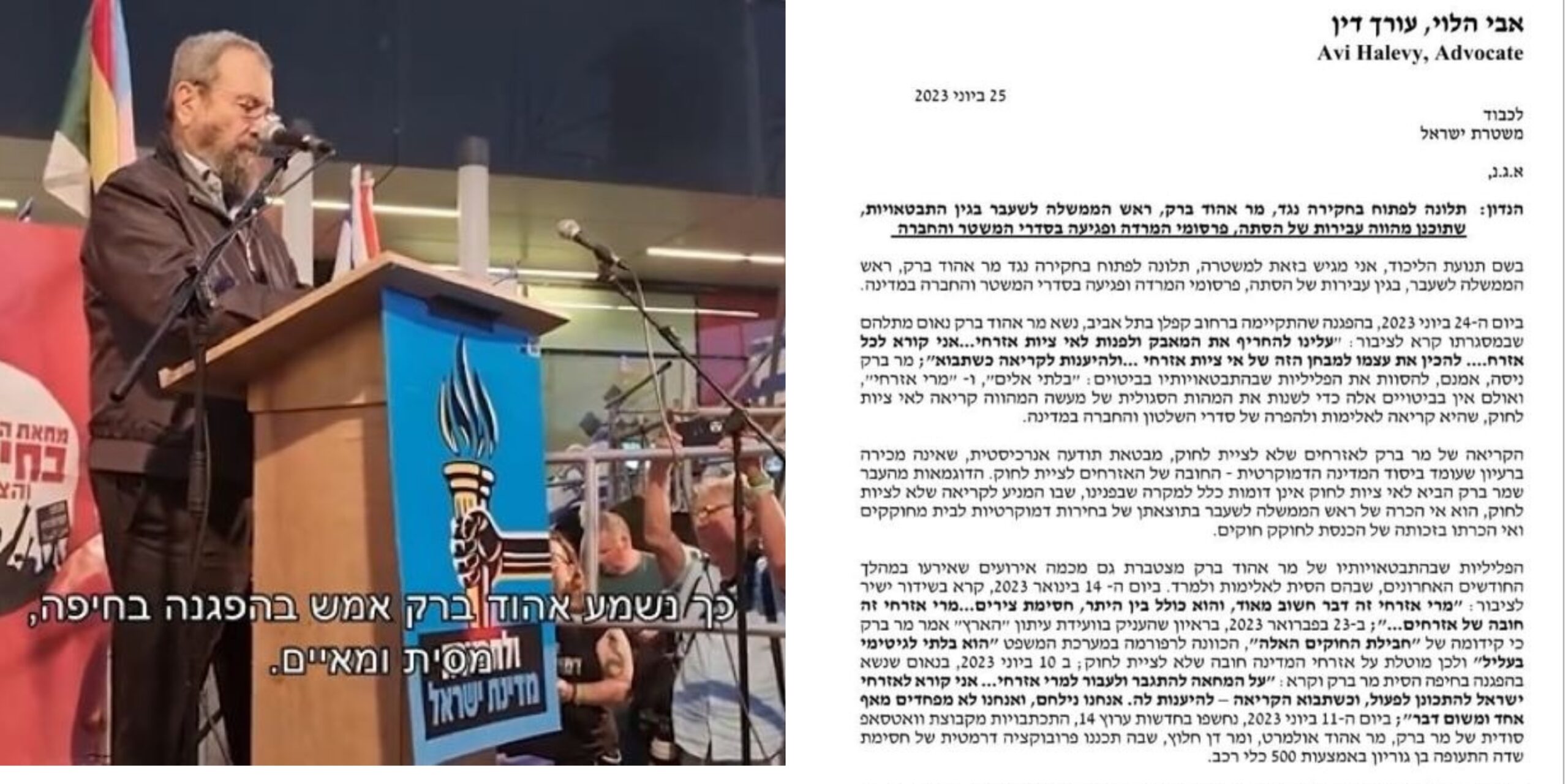 “On June 24, 2023, at a protest held on Kaplan Street in Tel Aviv, Mr. Ehud Barak gave an inflammatory speech in which he called on the public: ‘We must intensify the struggle and resort to civil disobedience… I call on every citizen… to prepare himself for this test of civil disobedience… and respond to the call when it comes.'”
