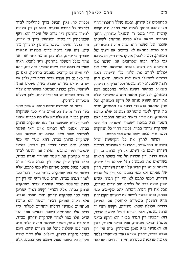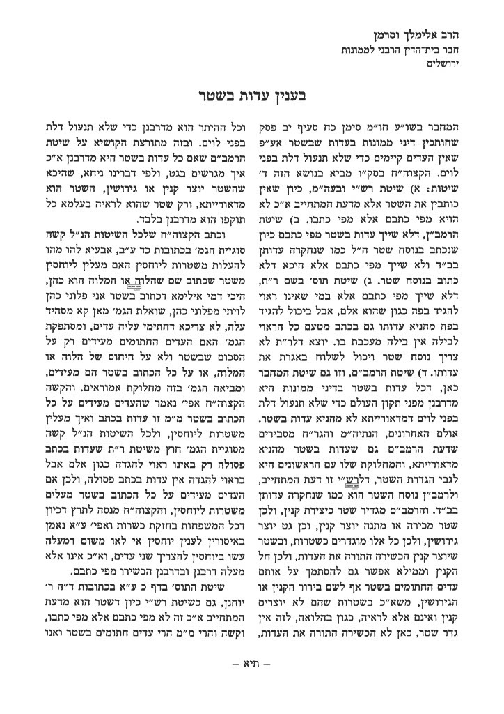 As a zchus for his holy Neshama and for the hostages being held by the evil rashayim – please learn and spread his Torah.. What follows is a translation. It was originally published in Kovetz Ohel Sara Leah in memory of Rebbitzen Sara Leah Rothstein a”h. The topic is Witnesses on a Document.