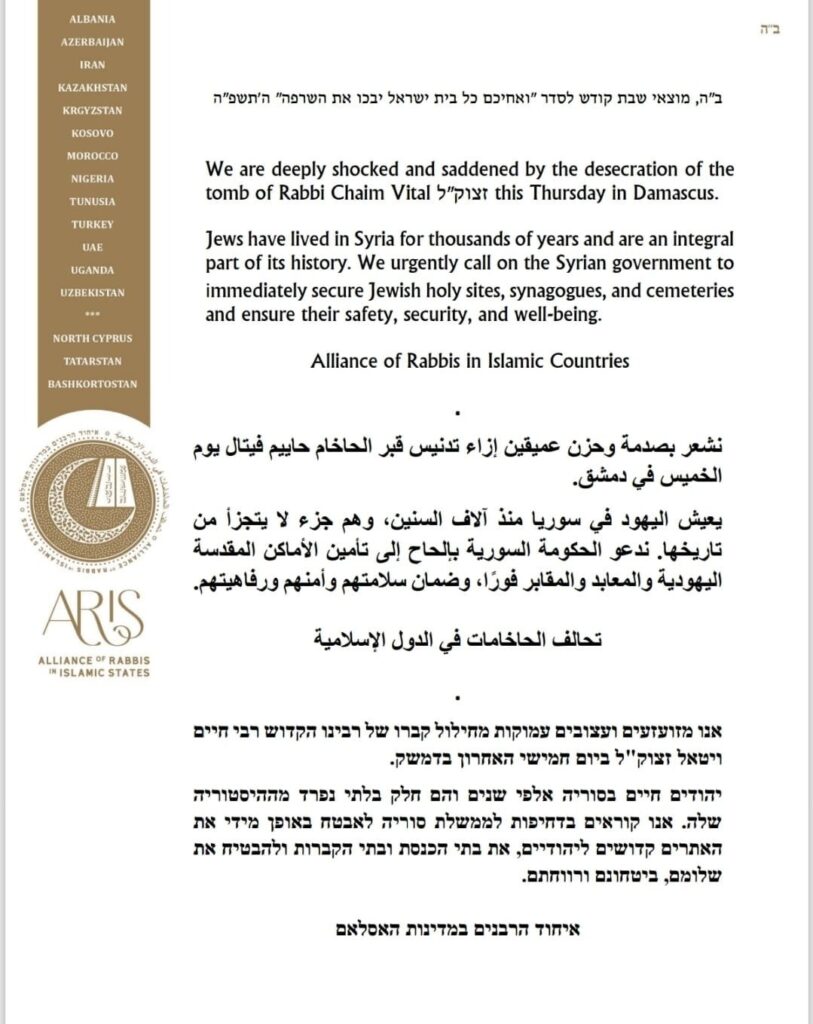 The Alliance of Rabbis in Islamic Countries issued a statement saying: “We are shocked and saddened by the desecration of the tomb of Rabbi Chaim Vital, z”tl this Thursday in Damascus.”