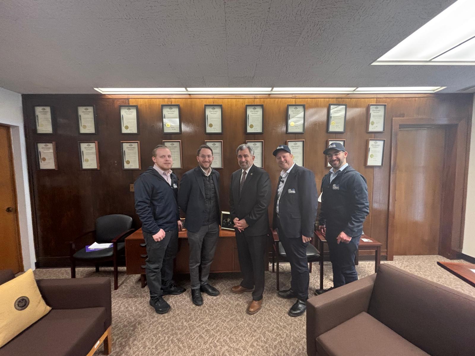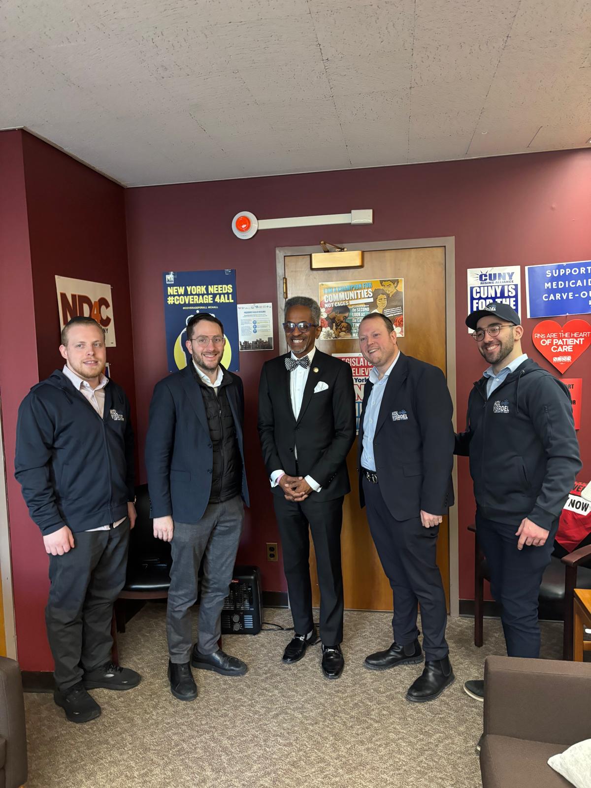 Assemblymember Micah Lasher (D-69), the prime sponsor of the proposed 25-foot buffer zone bill around houses of worship, met personally with the Kol Yisroel delegation. While Kol Yisroel expressed disappointment that the current proposal limits the buffer to 25 feet, participants emphasized their appreciation for Lasher’s willingness to meet in person and engage in open, respectful dialogue.