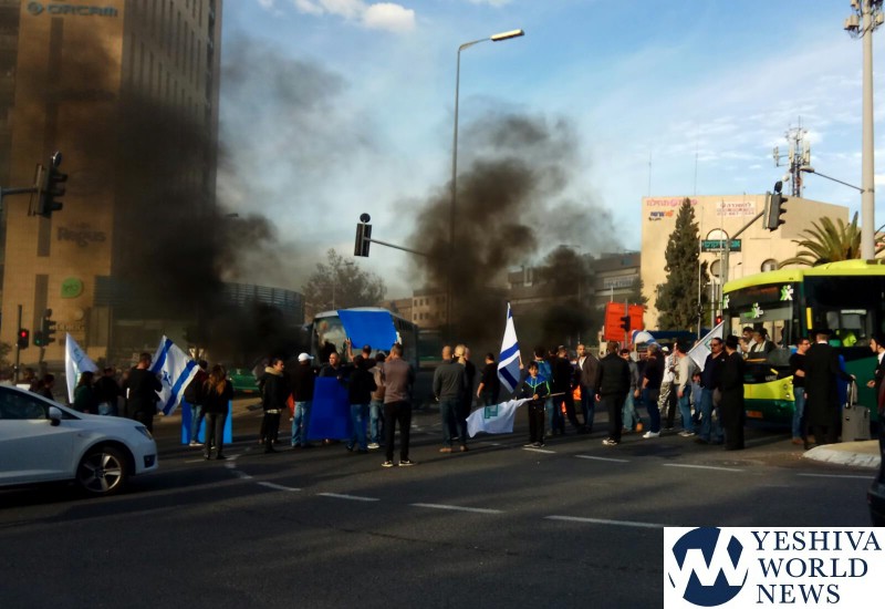 After their Sunday morning 29 Kislev protest, striking Teva Pharmaceutical employees took to the streets again Sunday afternoon, shortly before 3:00pm. They blocked the road to Har Chotzvim in the direction of Ramot, including burning tires.