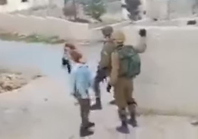 Two soldiers were standing the Tamimi’s driveway, when Ahed, along with another girl, went outside to drive the soldiers away, all the while trying to slap and kick them in an attempt to coax a violent reaction and capture it on film.