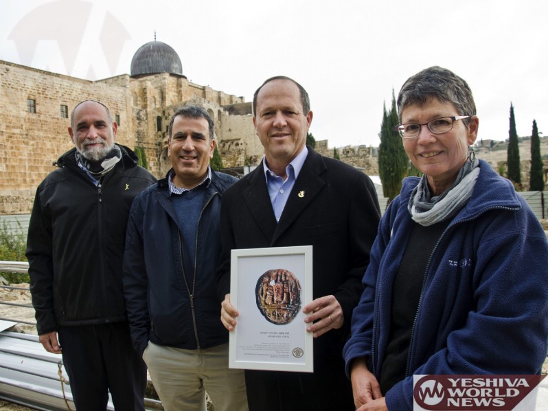 This extraordinary find is a lump of clay, stamped and pre-fired. It measures 13 X 15 mm and is 2–3 mm thick. The upper part of the sealing depicts two figures facing each other, and the lower part holds an inscription in ancient Hebrew script. The sealing was presented to the Mayor of Jerusalem, Nir Barkat, during his visit to Davidson’s Center, near the Kosel, last week. After the completion of the scientific research, the sealing will be on temporary exhibit in the mayor’s office.