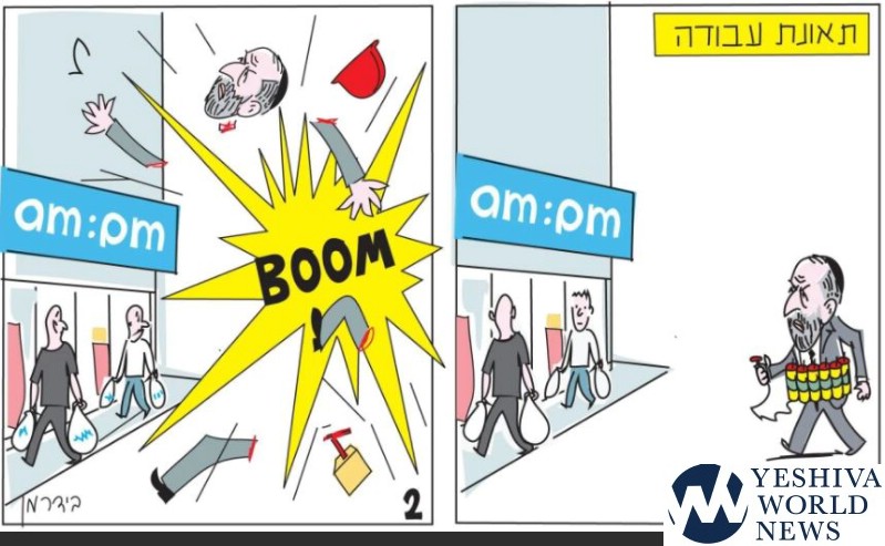 Deri has come under considerable criticism over recent days as he continues efforts to pass the Shabbos/Makolet Bill, including reported efforts to bring MK Yehuda Glick to Knesset to vote on the bill shortly after the levaya of Glick’s wife Yaffa A”H. The caption to the cartoon is “work accident” as Deri is seen blowing up prior to entering the store, which operates on Shabbos, resulting in his demise but without injury to shoppers in the store.
