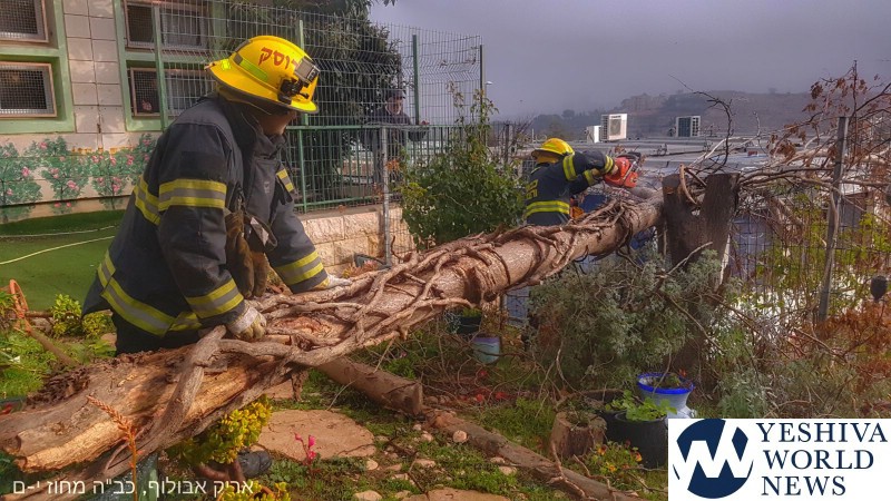 Jerusalem fire department spokesman Udi Gal reports that the weekend storm resulted in a very large tree landing on a school fence in the southern Gilo neighborhood of the capital. B’chasdei Hashem, this occurred at a time the school was empty.