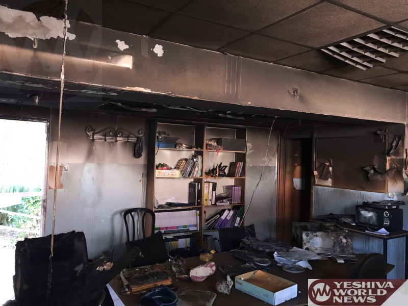 Five fire trucks responded to the blaze. It appears a lit object, possibly a firebomb, was hurled into the teacher’s room as well as trying to set fire to a school advisor’s office next door. Damage to these rooms was extensive. They also tried setting the principal’s office on fire. Rabbi Fruchter explained during the phone interview that damage is currently assessed to be about 200,000 NIS.