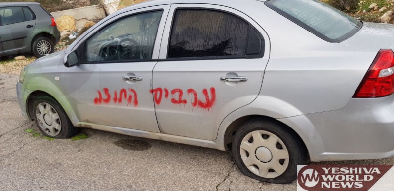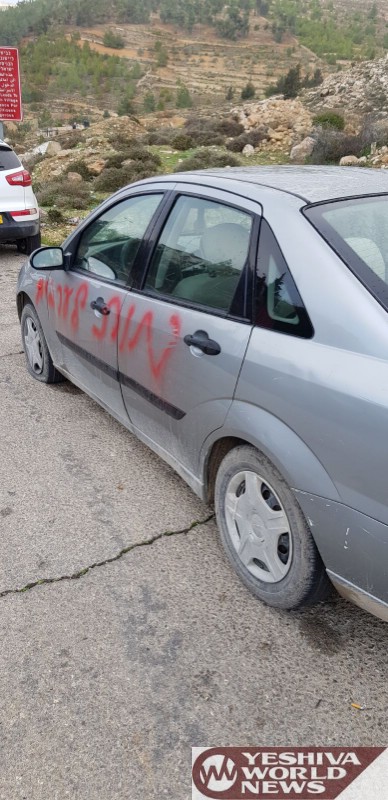 “Death to Arabs” and “Arabs Out” was among the graffiti painted on vehicles in the PA (Palestinian Authority) village of Bet Iksa, which is located about six kilometers northwest of Jerusalem. Police are investigating.