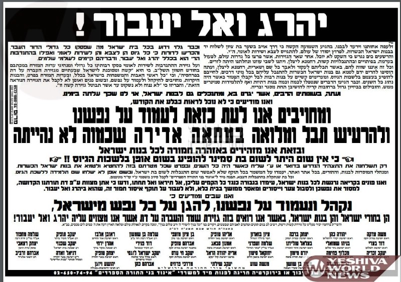 “זלעפה אחזתנו וירעד לבבנו, בהגיע השמועה הקשה כי דרך אויב בשער בת ציון לשלוח יד בבנות ישראל הכשרות, לפרוץ יסודו של עולם, להתגייס לצבא ושירות לאומי”