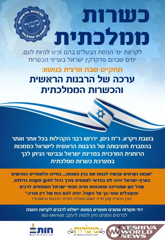 Chief Rabbi of Israel Rabbi Dovid Lau Shlita penned a letter to rabbonim around the country regarding this coming Shabbos, Parshas Vayikra, Shabbos Rosh Chodesh Nissan, which the Rabbinate is dedicating to kashrus and the Chief Rabbinate’s kashrus system.