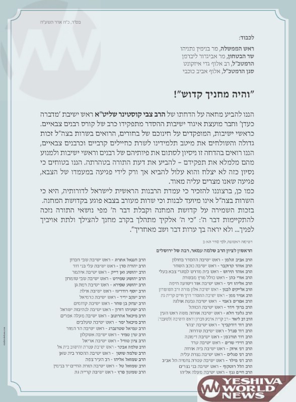 The letter sent on Thursday, 28 Adar, was signed by prominent rabbonim, including Chief Sephardi Rabbi of Jerusalem HaGaon HaRav Shlomo Moshe Amar Shlita, HaGaon HaRav Dov Lior Shlita, HaGaon HaRav Shlomo HaKohen Aviner Shlita, and HaGaon HaRav Yehoshua Shapira Shlita.