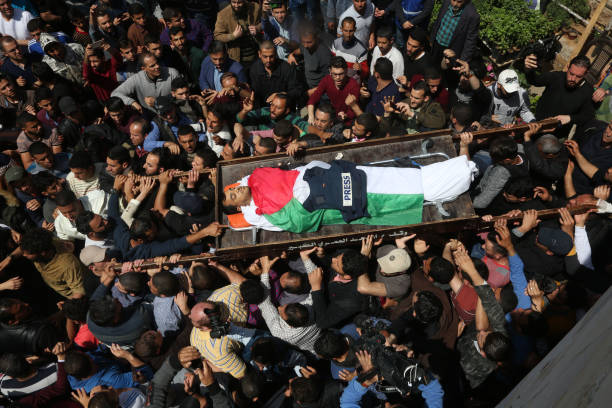 At the funeral Saturday, Murtaja’s body was draped in a Palestinian flag with his flak jacket reading “press” placed upon it as it was carried through the streets of Gaza.
