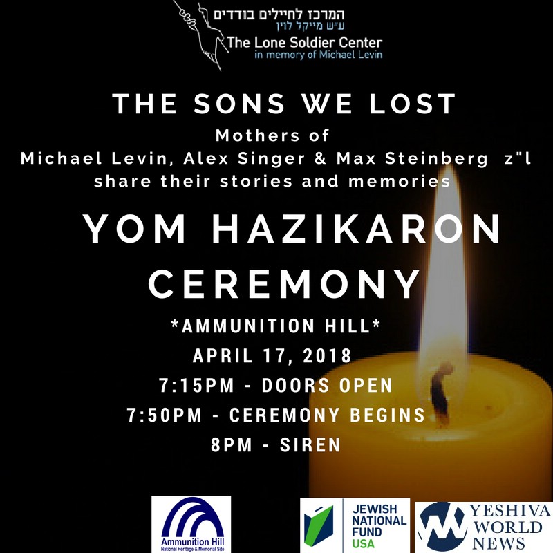 This year’s ceremony will feature the mothers of fallen lone soldiers Alex Singer, Michael Levin and Max Steinberg, z”l, and a musical performance by musician Shlomo Katz.