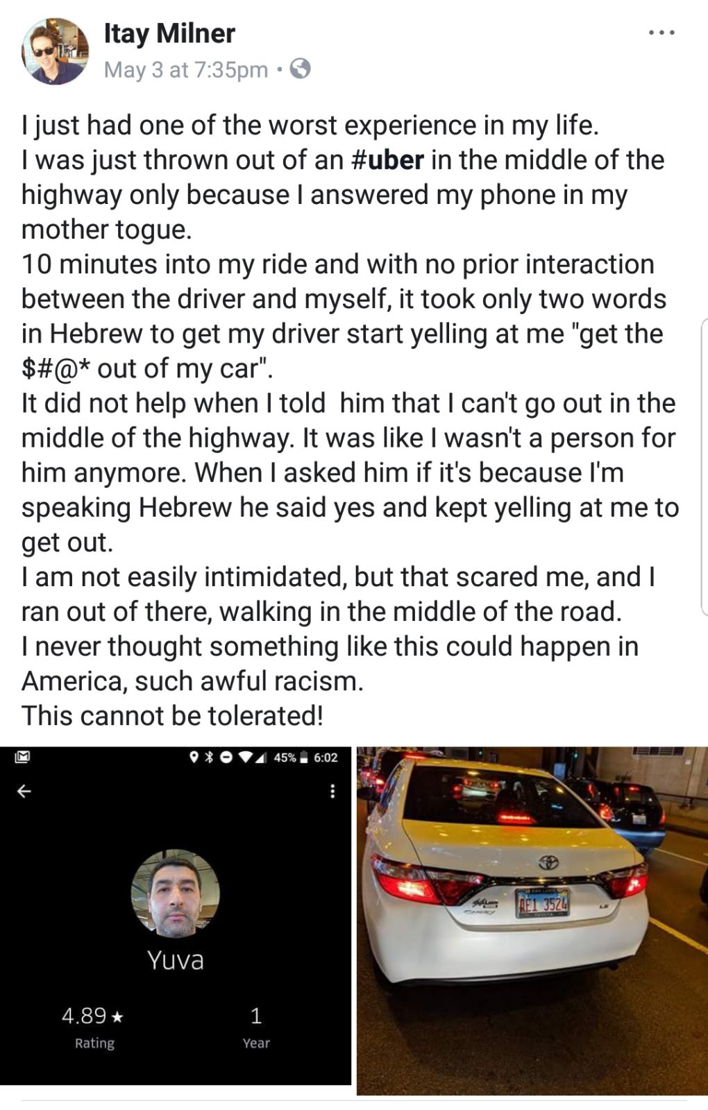 Milner told The Associated Press he was taking the ride-sharing service home Thursday about 5:30 p.m. when he said “How are you?” in Hebrew into his phone. Milner says the driver cursed at him and told him to “get out now.” Milner says the driver told him it was because he was speaking Hebrew.