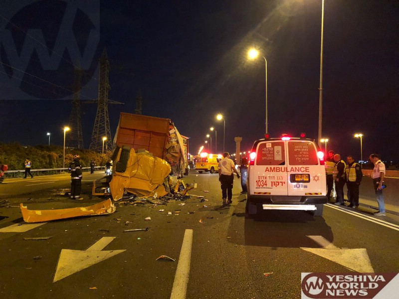 MDA officials report that at 4:39AM on Tuesday, 1 Sivan, the dispatch center received a call for a collision between two trucks on the Ayalon Highway near the Hasira Interchange on the way to Ayalon south. The accident was located on Route 20 near the Shivat HaKochavim Interchange.
