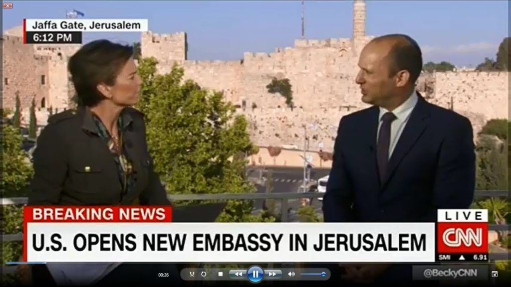 Nayit Hayehudi leader Minister Naftali Bennett was interviewed by CNN following the opening of the U.S. Embassy in Jerusalem. Tough questions were lobbed at him by the reporter, but were faced with harsh responses: