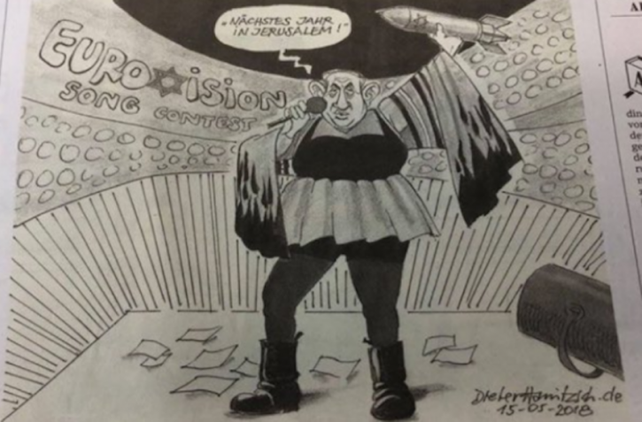 The drawing depicts Netanyahu dressed as Israeli singer Netta Barzilai, who won this year’s Eurovision song contest. The heart that forms the “v” in Eurovision is replaced with a Star of David and Netanyahu is hoisting a missile in his hand, saying “next year in Jerusalem.”